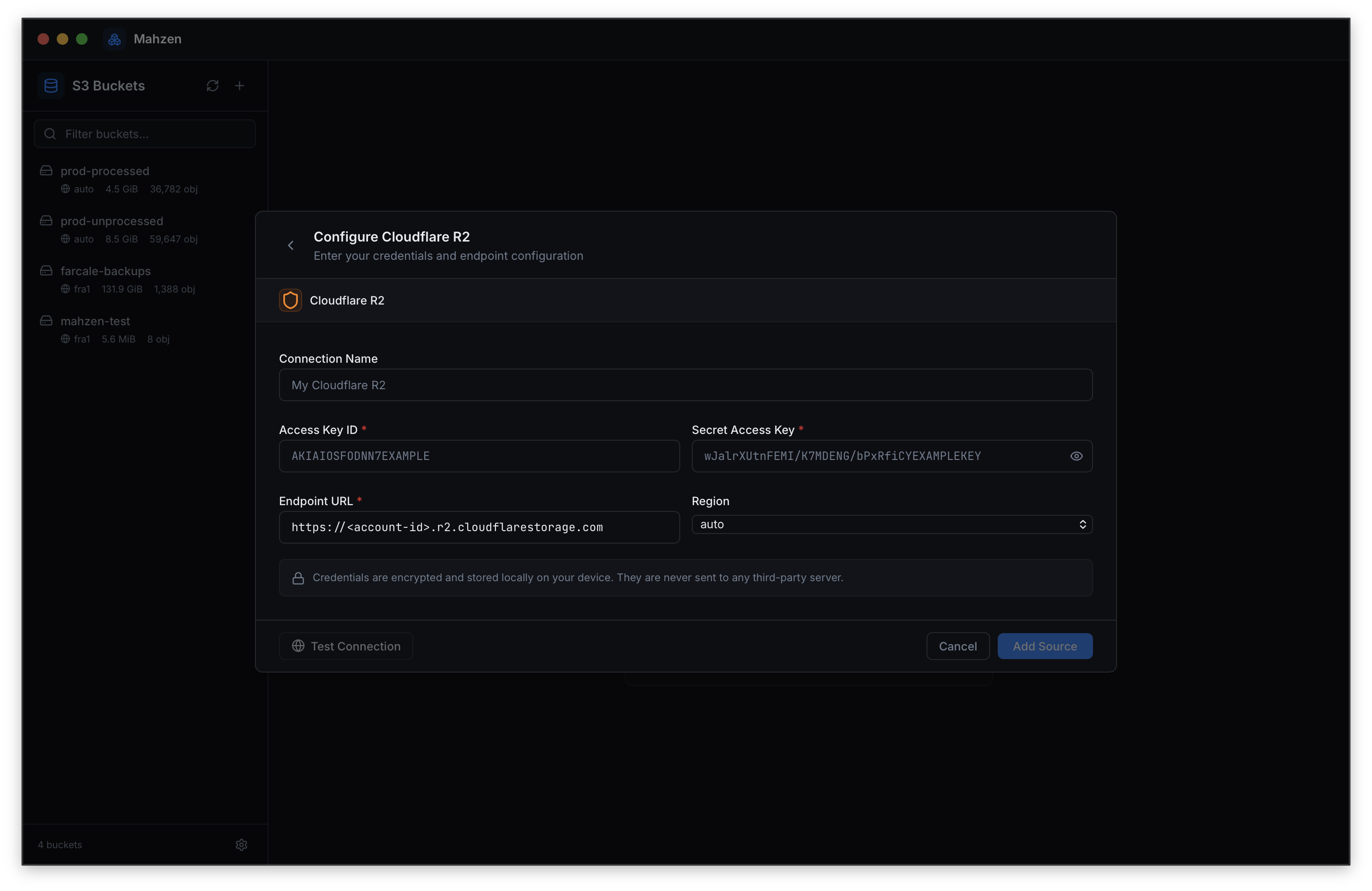 Your credentials stay on your machine. No accounts, no telemetry, no cloud relay — every connection goes directly to your storage provider.